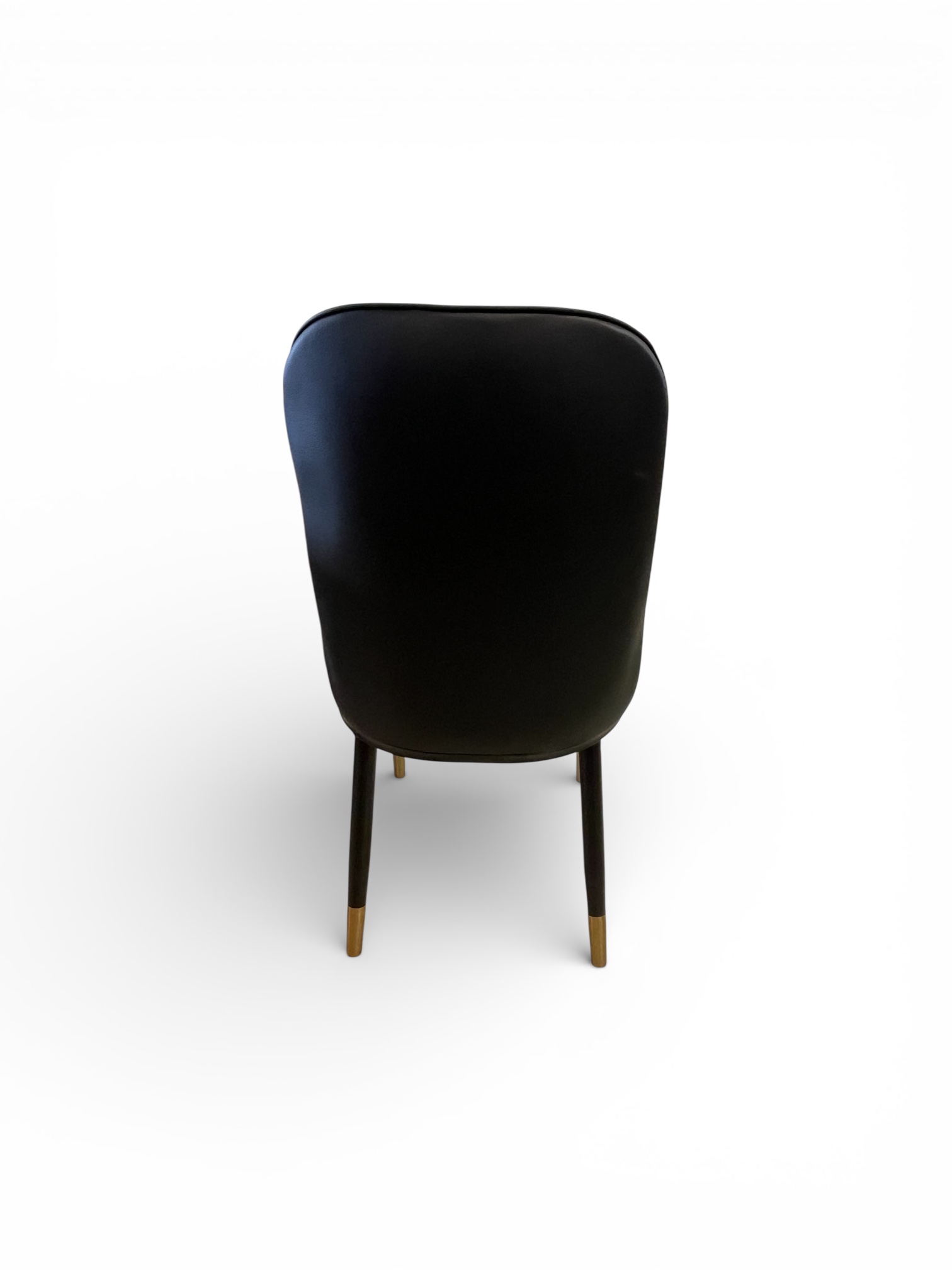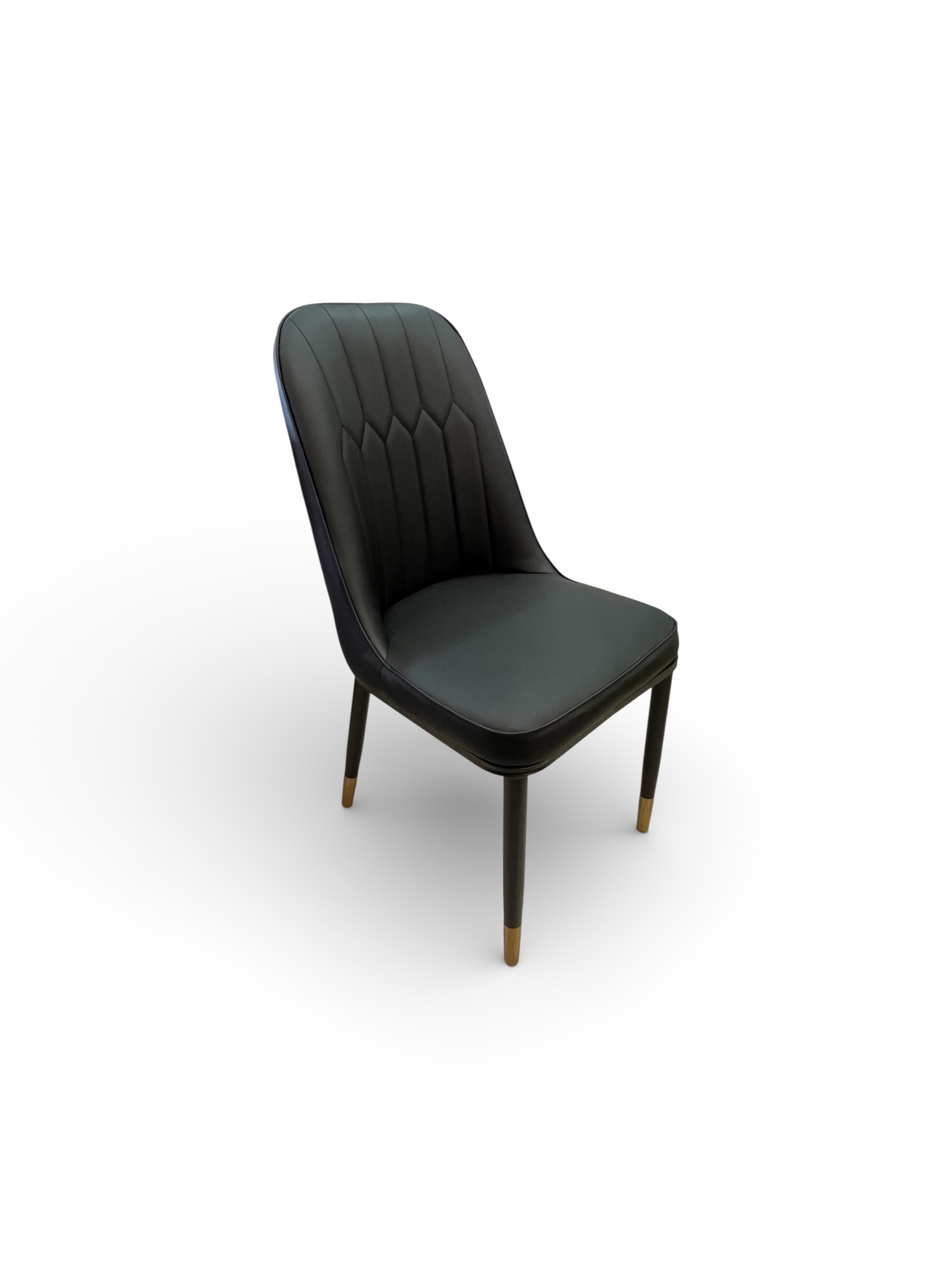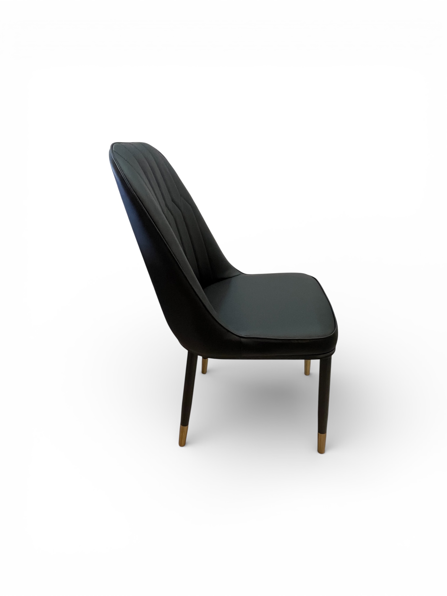 Su respaldo alto con diseño acanalado vertical aporta un toque moderno y distintivo, mientras que su tapizado en tono negro le da versatilidad para integrarse fácilmente en ambientes minimalistas, industriales o modernos. Las patas estilizadas en acabado negro con detalle metálico en tono dorado brindan un contraste sutil y refinado que realza su diseño.