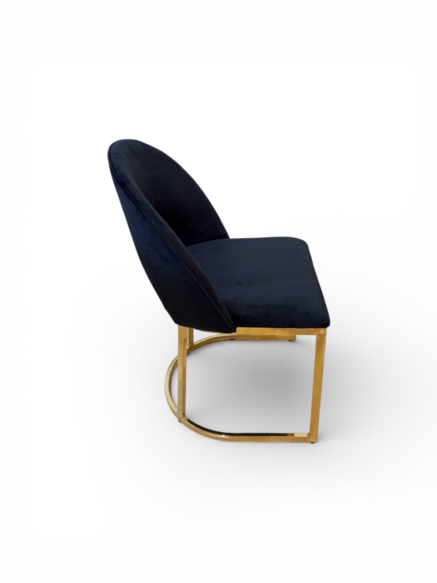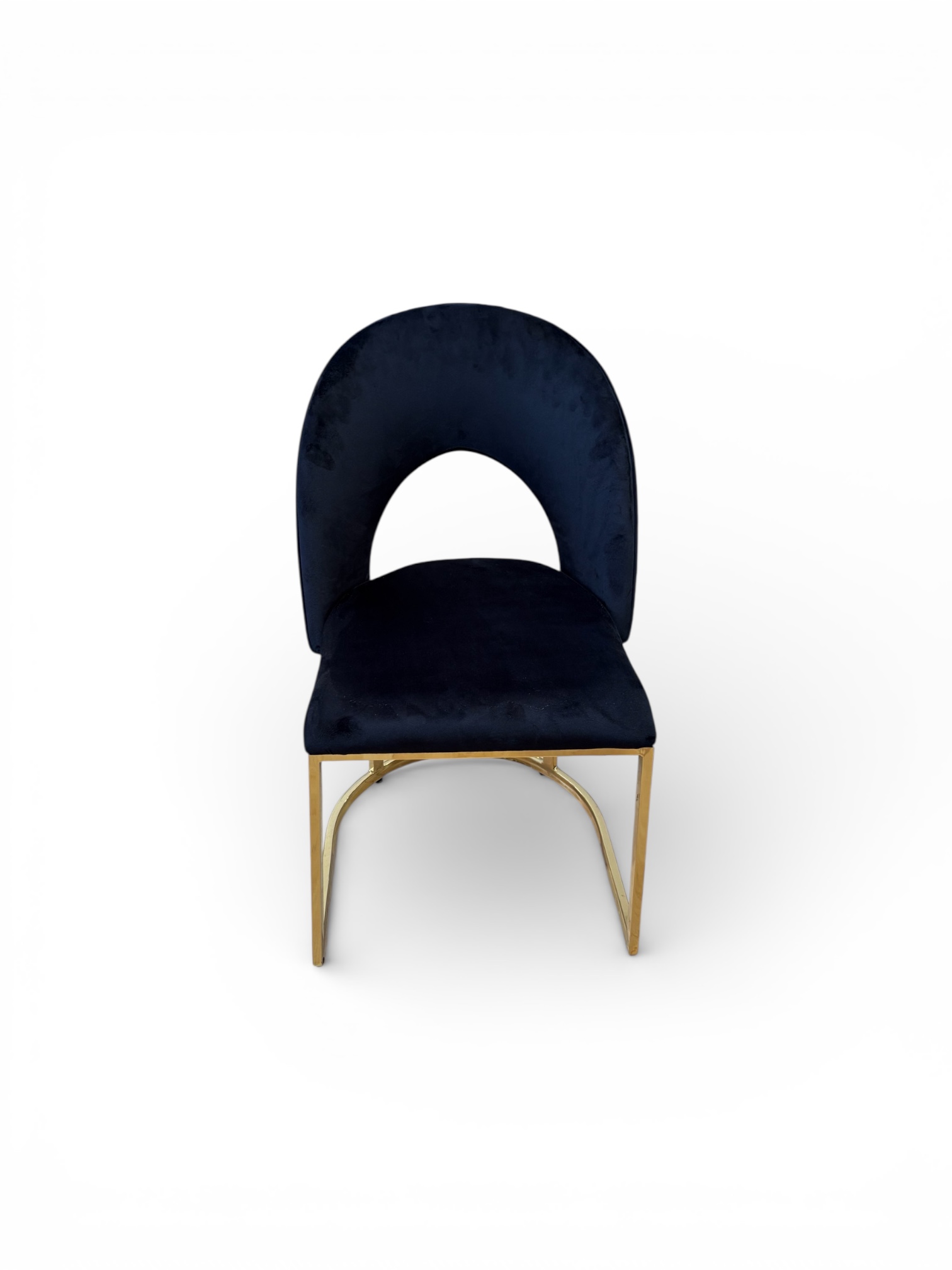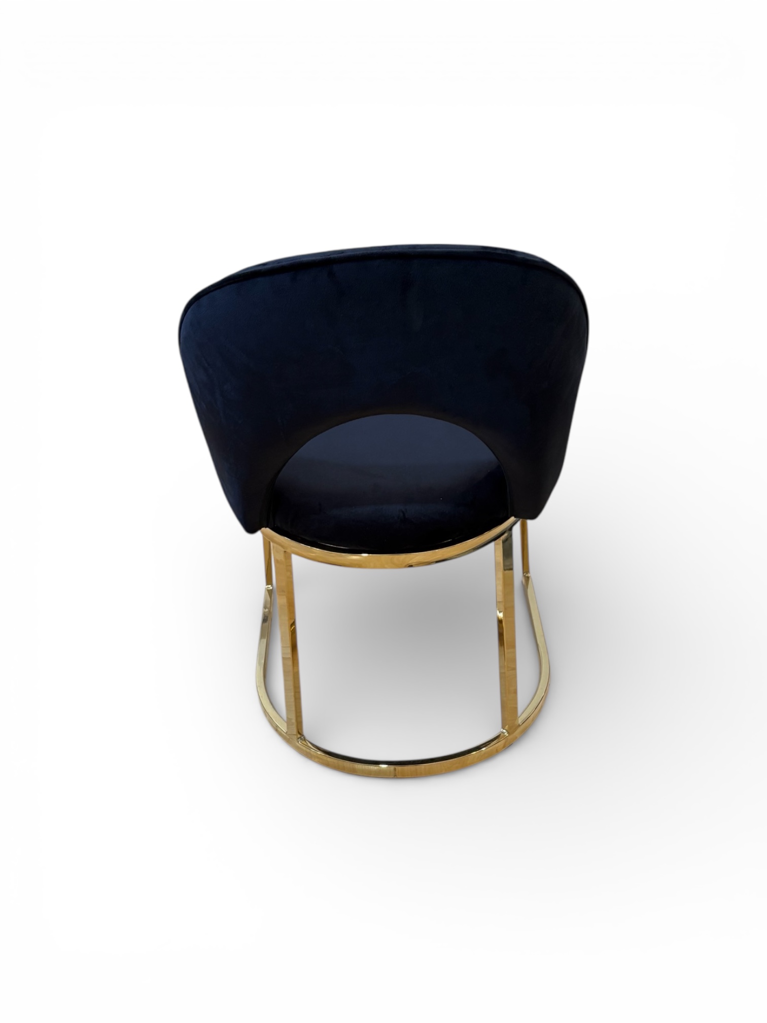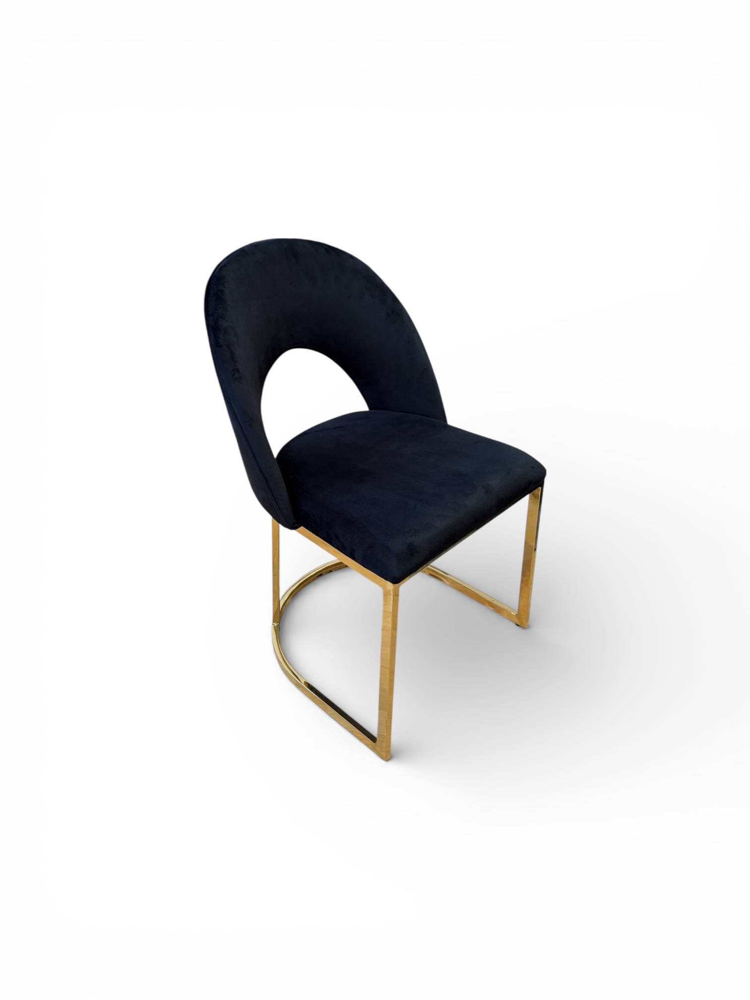 Su respaldo curvo con apertura central no solo aporta un toque moderno y distintivo, sino que también brinda un soporte ergonómico que abraza la espalda, ofreciendo una experiencia cómoda incluso en reuniones prolongadas. El tapizado en terciopelo aporta lujo y personalidad, mientras que su base metálica en acabado dorado añade un contraste glamuroso y refinado que transforma cualquier espacio.