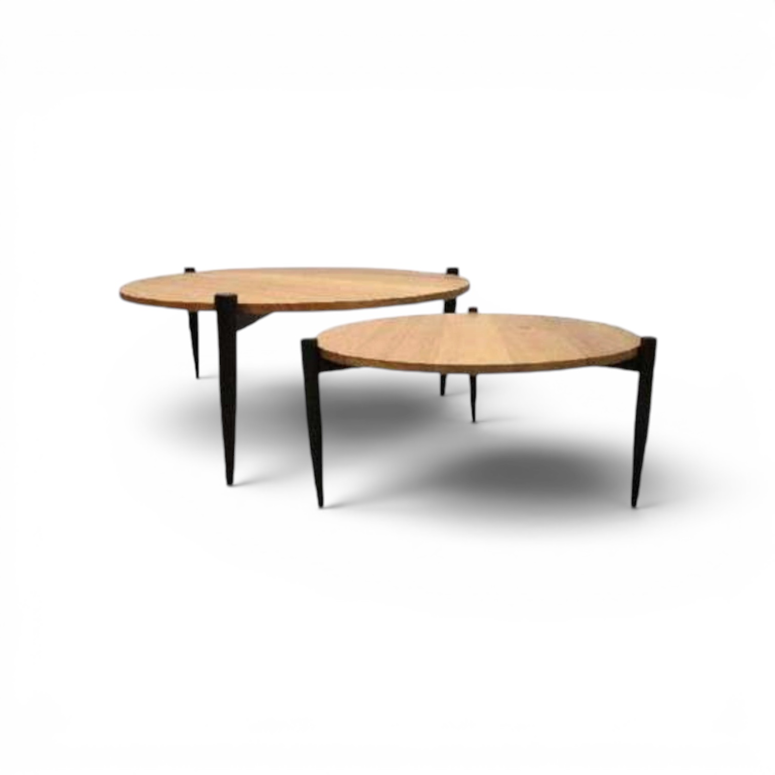 Este hermoso set de dos mesas de centro redondas nesting combina la calidez de la madera clara con patas negras delgadas y elegantes. Su diseño permite usarlas juntas para crear un gran impacto visual o separarlas según la ocasión: una como mesa principal y la otra como auxiliar o mesa lateral.