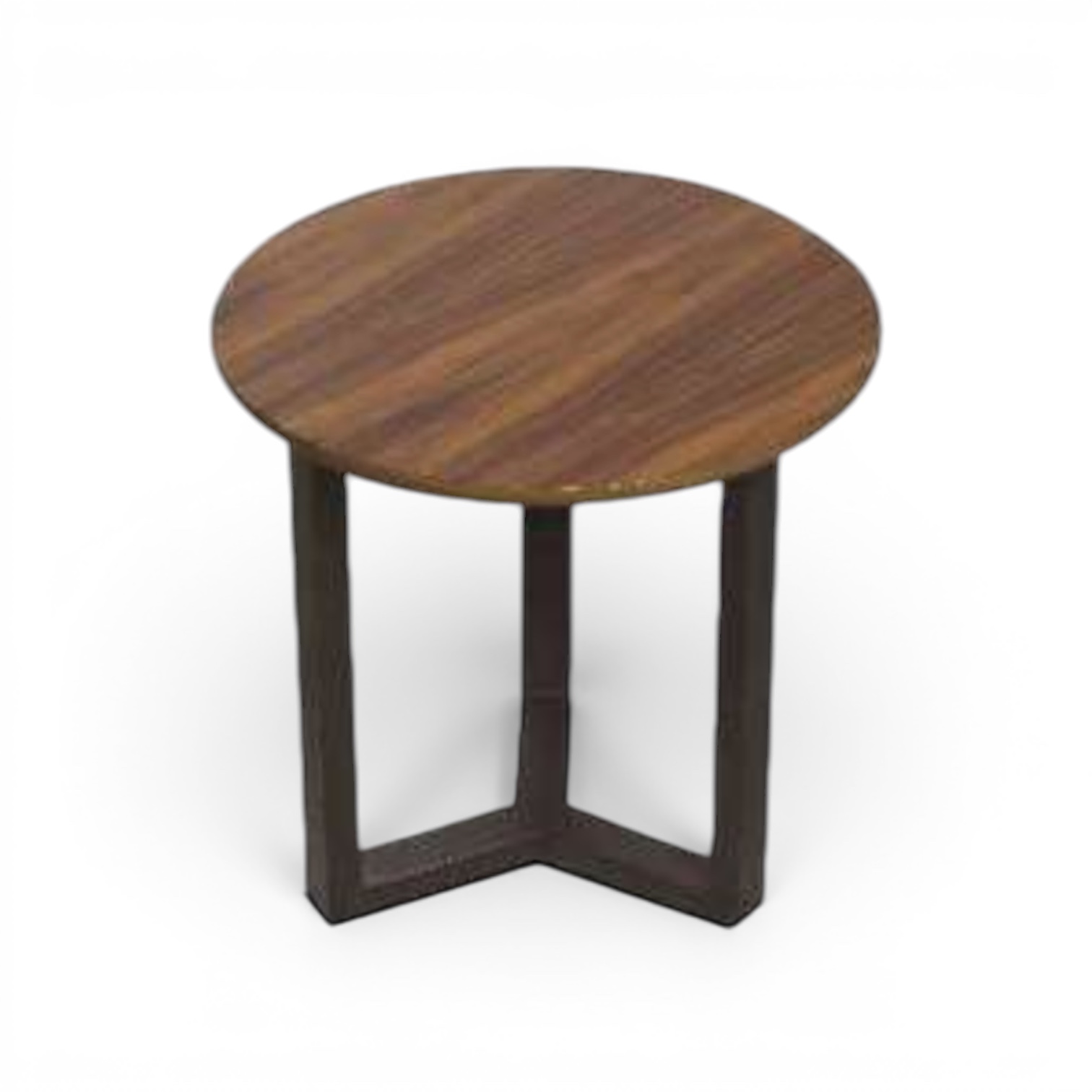 Esta refinada mesa lateral combina la calidez de la madera natural con la fuerza del grafito en un diseño limpio y sofisticado. Su cubierta redonda de color nogal con hermoso veteado aporta textura y calidez, mientras que su base con estructura geométrica en forma de Y ofrece estabilidad y un toque arquitectónico moderno.